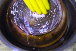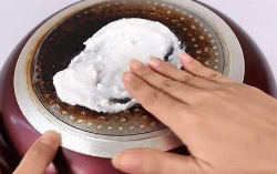 最后我们说一说比较简单的方法,那就是吸附式去灰法,这也是我们今天最后说的一种方法,我们将锅底先进行简单的清洗,用水冲过以后静放一会,我们让锅底半干的时候在上面铺上一层薄薄的面粉,最后在面粉的表面再撒上少许的食盐,由于面粉与黑灰接触后能起到吸附的作用,遇水后变得很粘,这时混合物与食用盐的混合增加了摩擦力,最后再用刷子轻轻冲刷即可,锅底将焕然一新。