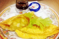 3、将苹果片铺在蛋饼上,带底部熟后在翻转煎,然后整边装盘